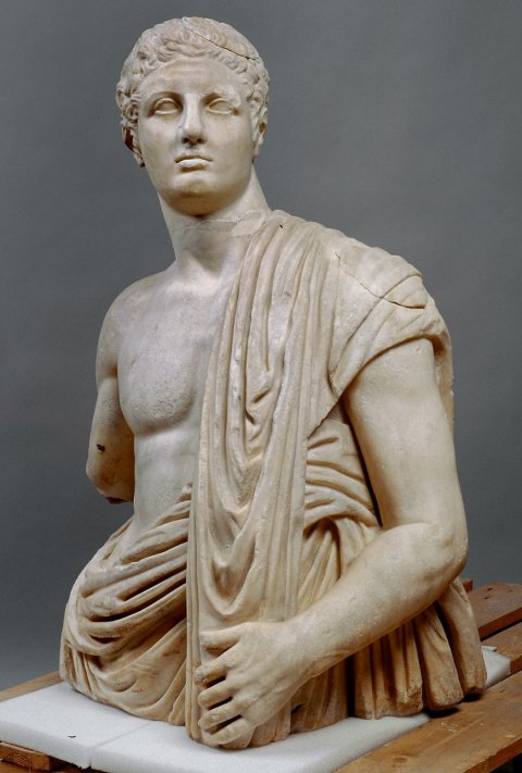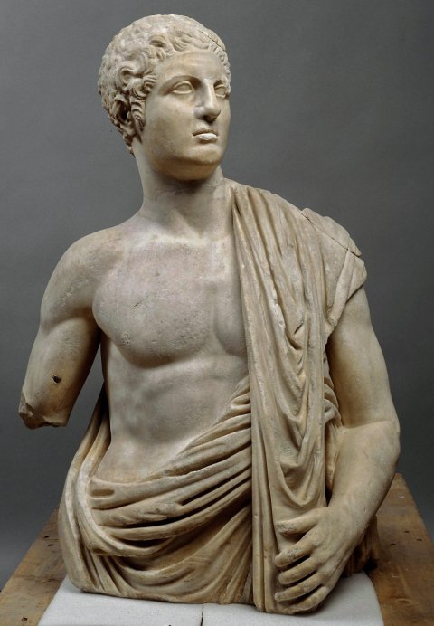 - Torso mit Kopf, linkem Arm u. rechtem Oberarm, ergänzte Bruchstelle im Hals