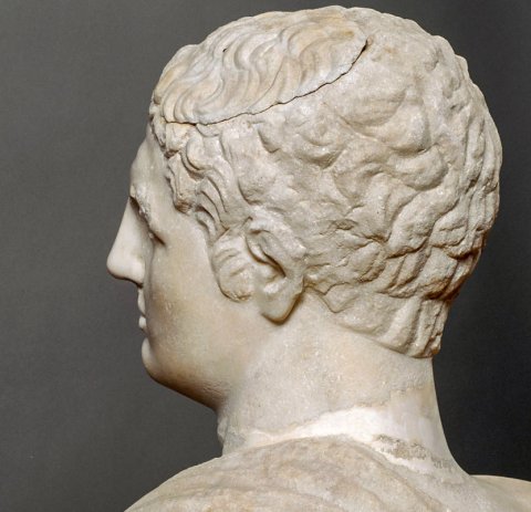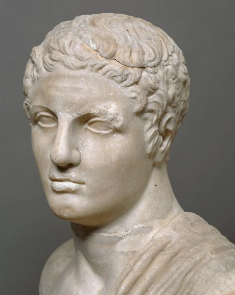 - Stehender Jüngling im Mantel, Kopf mit kurz gelocktem Haar zur linken Seite gedreht.