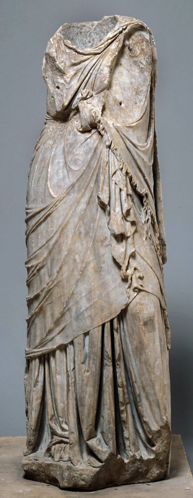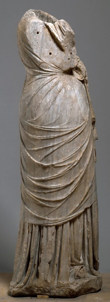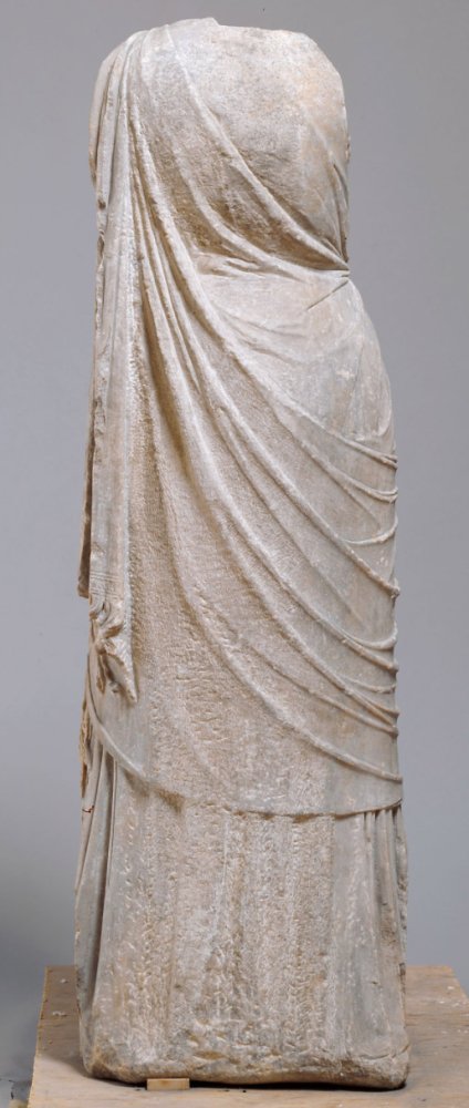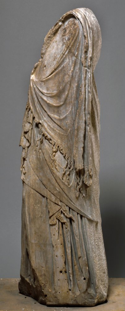 - Kopf, Arme, Teile der Gewandfalten waren angesetzt u. fehlen heute. Basis tlw. abgebr.