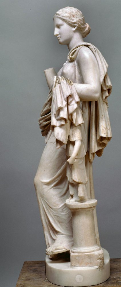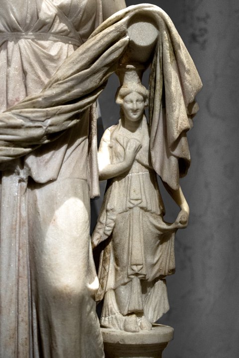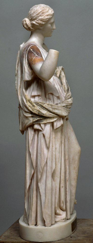 - Mythische Figur: stehende, mit dem linken Arm auf eine archaistische Mädchenstatuette mit Polos gelehnte Artemis im langen gegürteten Chiton; Köcherband über der Brust, zusammengerollter Mantel von der linken Schulter, um die Hüften und über dem linken Arm.