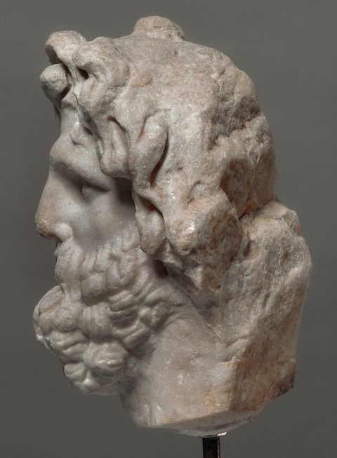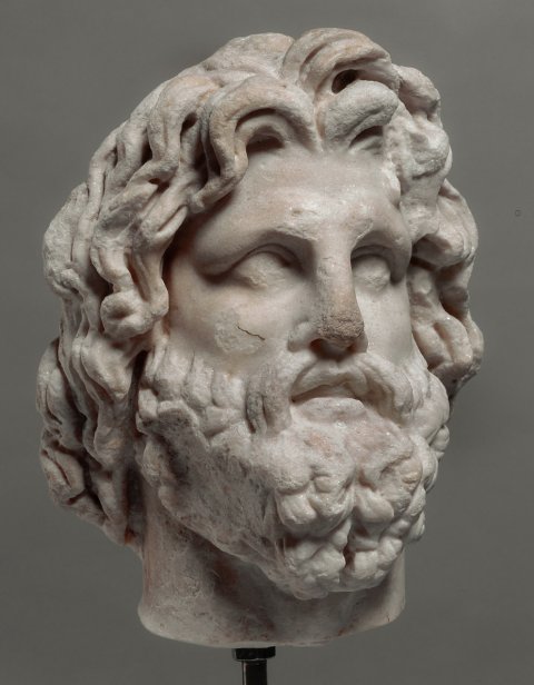 - mythische Figur: bärtiger Zeuskopf mit langen Locken