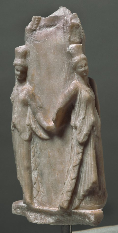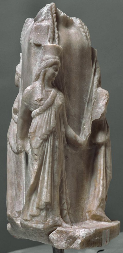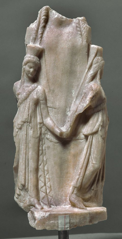 - Mythische Figur: dreigesichtiges Hekataion, umgeben von drei sich an den Händen fassenden Mädchen mit Polos und archaisierendem Gewand (Chariten).