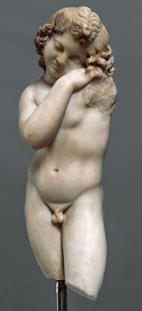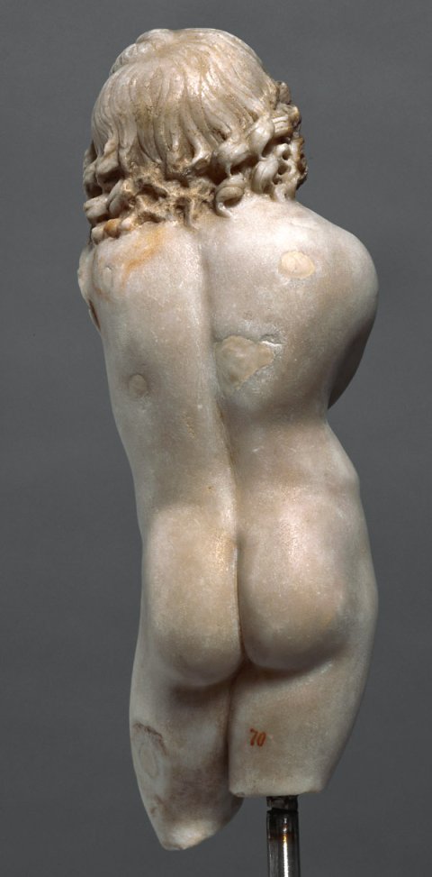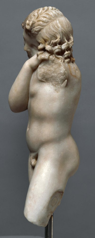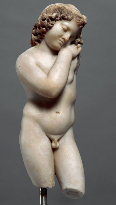 - Kindlicher geflügelter Trauergenius, auf gesenkte Fackel gelehnt. Aus Grabbezirk oder Grabbau.