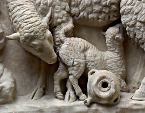 - Konkav gewölbtes Relief von einer Brunnenfassung. In einer Felsgrotte säugendes Mutterschaft mit Lamm. Zwischen den Beinen des Lamms liegendes Gefäß mit Öffnung für ein Wasserrohr. Oberhalb der Grotte rechts Haus mit offener Tür, aus der ein Hund tritt. Links Baum, an dem ein volles Bündel hängt.