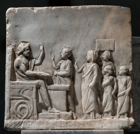 - Rahmenlose Platte mit Standleiste. Links thronender bärtiger Gott (Asklepios oder Zeus ?) mit Schale in der Rechten; neben dem Thron Schlange, vor ihm Altar. Von rechts herankommende Adoranten (Mann, Frau, zwei Kinder, dahinter Diener (?) mit Kiste auf dem Kopf.