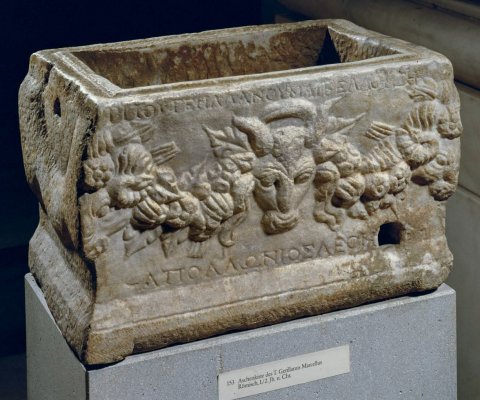 - Auf der Vorderseite an Stier- und Widderköpfen aufgehängte Fruchtgirlande, auf den Nebenseiten Girlanden bossiert.