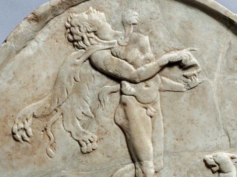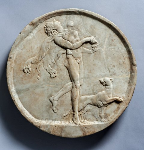 - Mythische Figur: tanzender Satyr mit Pantherfell, in den Händen Krotalen, zu seinen Füßen laufender Panther.