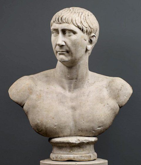 - Historische Person: unbekleidete Büste des Kaisers Trajan auf rundem Sockel.