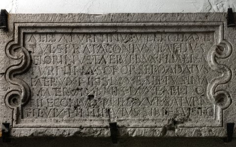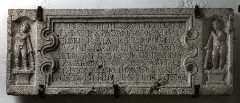 - Ael(ius) Saturninus vet(eranus) leg(ionis) II ad(iutricis) et / Tul(lia) Sperata coniux et Aelius / Florianus et Ael(ius) Verus fil(ii) Ael(ia) Sa/turnina soror Sep(timius) Q(u)ad(ratus / pater vix(it) ann(i)s LXXX et Sep(timia) Pusina / mater vix(it) ann(i)s LXXV et Ael(iae) Flo/rin(a)e con(iugi) vix(it) annis XXV et Saturn(a)e / fil(iae) vix(it) ann(is) IIII vi(v)us sibi et suis f(aciendum) c(uravit)
