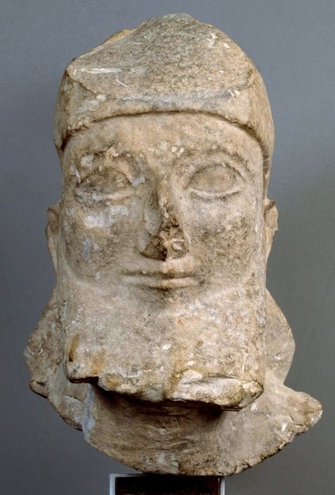 - Kopf eines Mannes mit Vollbart und Haube (?).