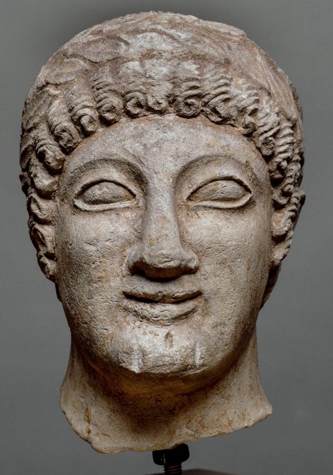 - Kopf eines Jünglings mit Löckchen um die Stirn, Haarrolle im Nacken und Lorbeerkranz. Teil einer Votivstatue.