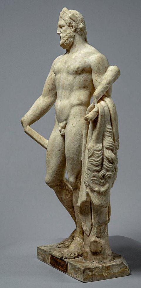 - Mythische Figur: stehender nackter bärtiger Hercules mit Kranz, über dem linken Arm Löwenfell, in der Linken Keule. Neben dem linken Bein Baumstammstütze.