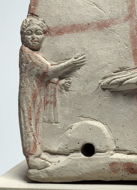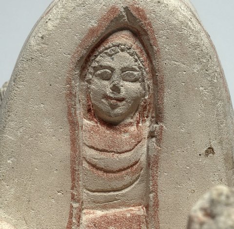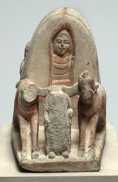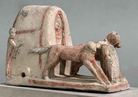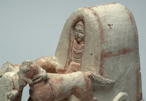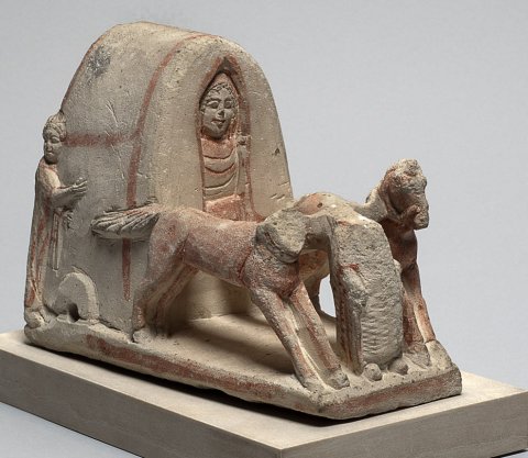 - Grabbeigabe: Modell eines zweirädrigen Planwagens mit Pferdegespann. Zwischen den Pferden stehender Mann im langen Gewand, in der Öffnung der Wagenplane sitzende Frau mit Schleier, auf der Rückseite des Wagens stehende Dienerin.