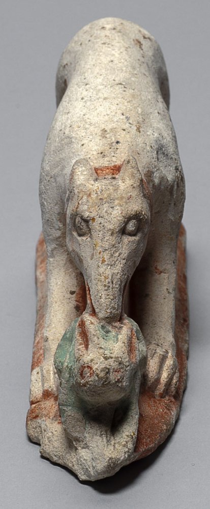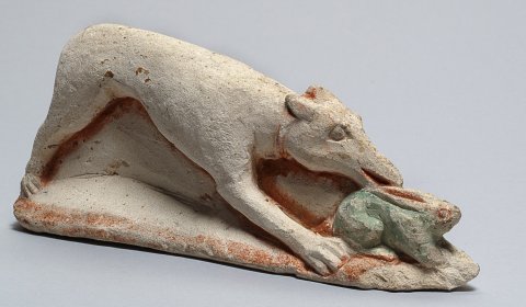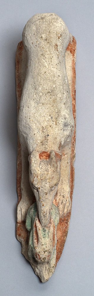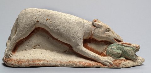 - Jagdhund, der einen Hasen fasst. Votivplastik mit roter und grüner Bemalung.