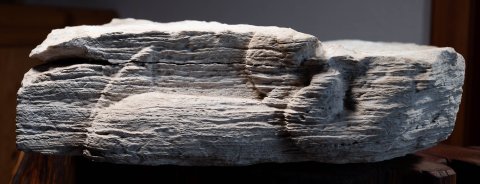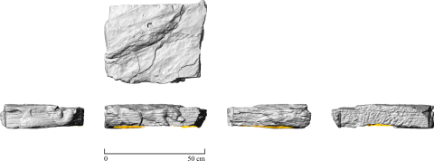 - rechts abgebr., Ober- u. Unterseite abgeschlagen, stark verwittert