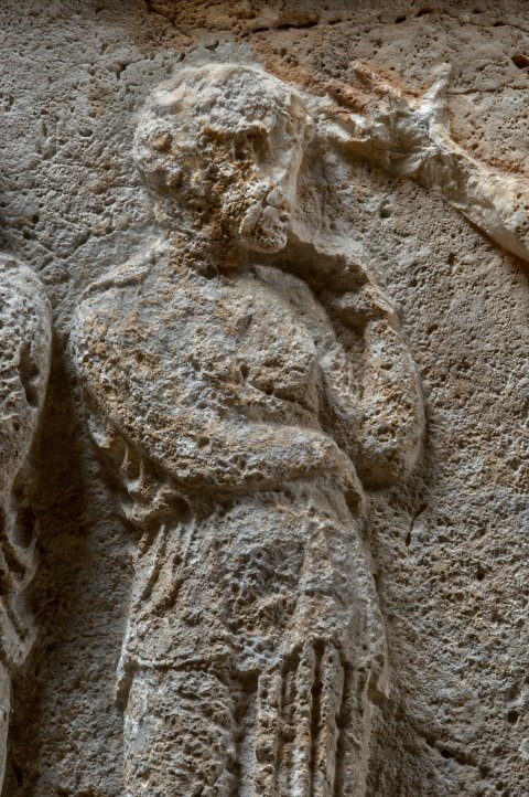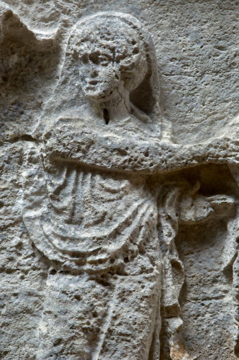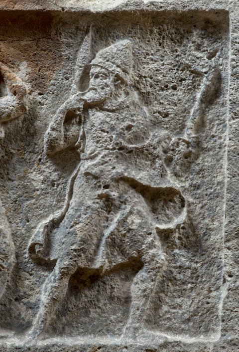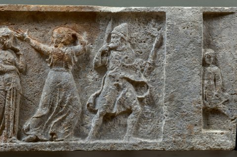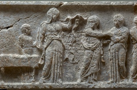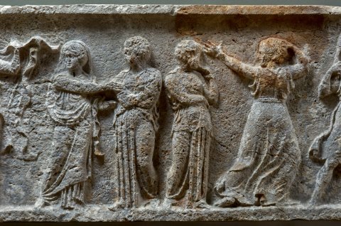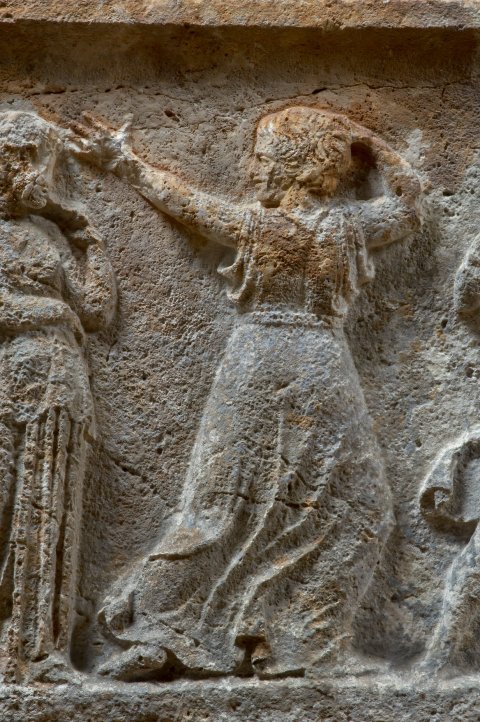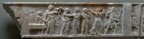- Mythos (Odyssee): Penelope mit fünf Dienerinnen; rechts eilt Schweinehirt Eumaios mit Schwert und Fackel zur offenen Tür , durch die ein kleiner Mundschenk aus dem Speisesaal flieht.