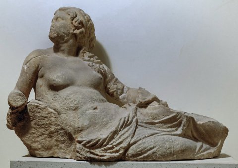 - Mythische Figur: gelagerte Frau mit offenem Haar, entblößtem Körper, Mantel um Hüften und Beine, Reif am linken Oberarm. Personifikation aus dem Nordgiebel des Hieron.
