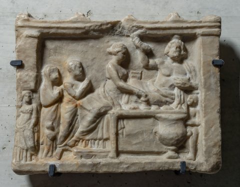 - Relieftafel mit architektonischem Rahmen (Dachrand mit Antefixen, seitlich Pilaster). Totenmahl (Bankettszene) mit auf einer Kline gelagertem Mann (Heros) mit Polos, in der erhobenen Rechten Rhyton, vorn Tisch mit Speisen und großer Krater. Am Fußende der Kline sitzende Frau, von links herankommende Adoranten.