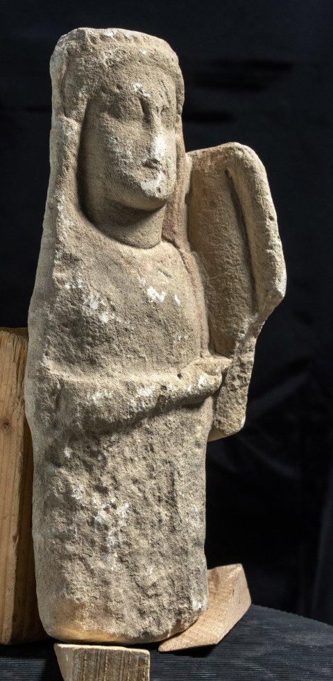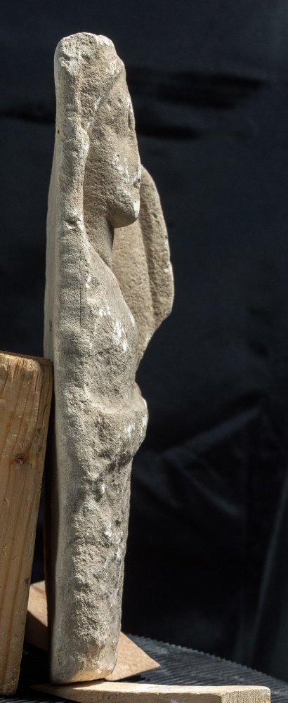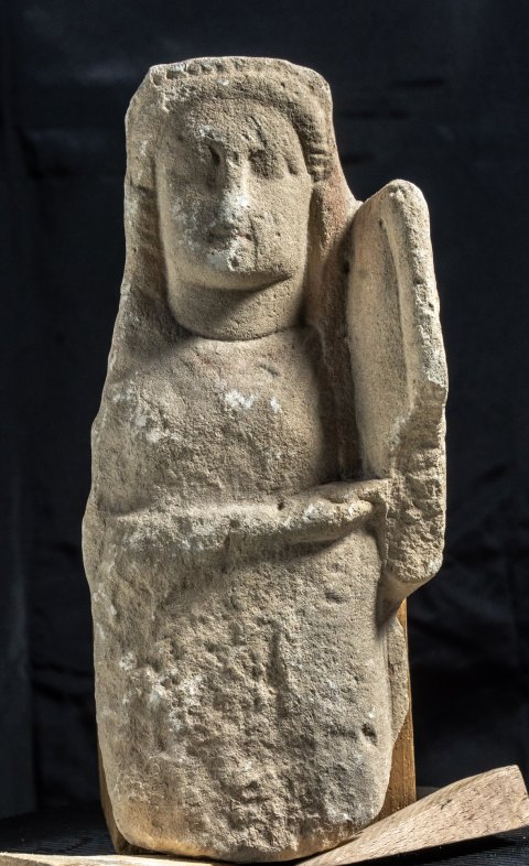 - Stehende bekleidete Frau mit Schleier (?), im linken Arm Lyra.