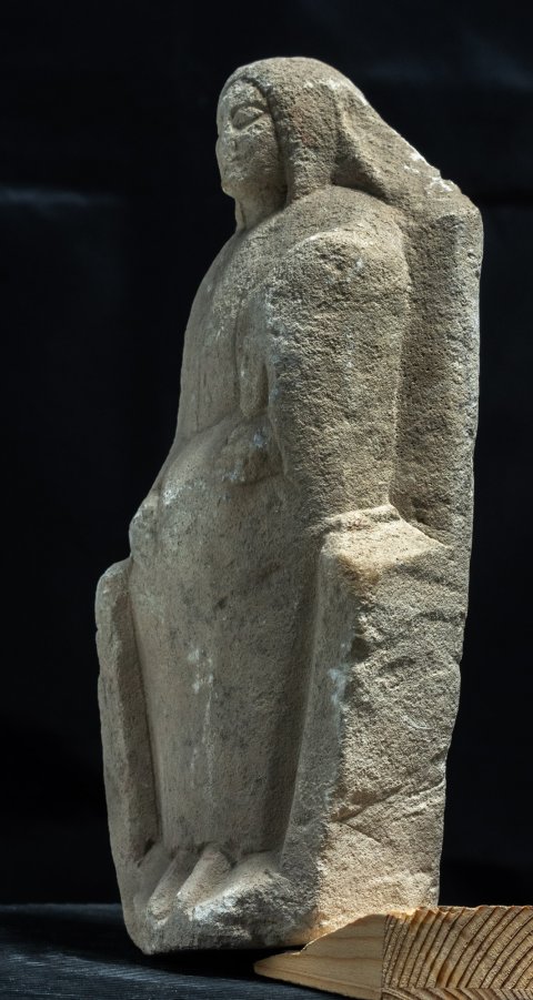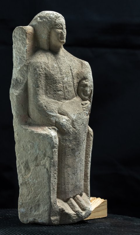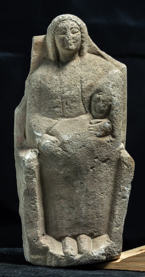 - Mythische Figur: thronende Göttin (Kourotrophos), langes Gewand, Mantel, auf den Knien Wickelkind.