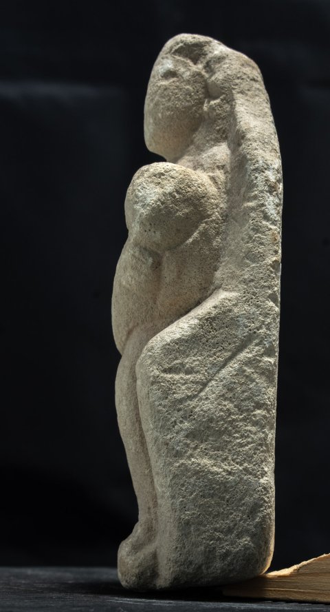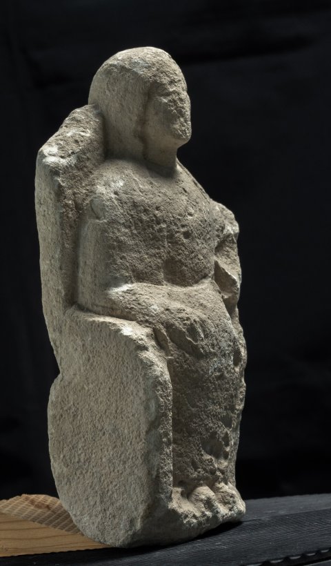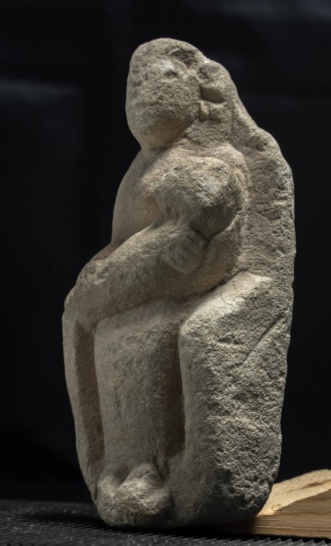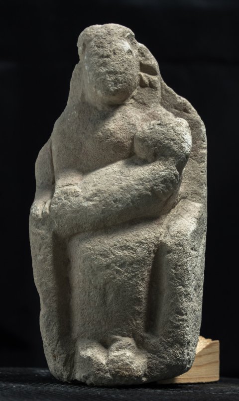 - Mythische Figur: thronende Göttin (Kourotrophos), langes Ärmelgewand, auf den Knien Wickelkind.