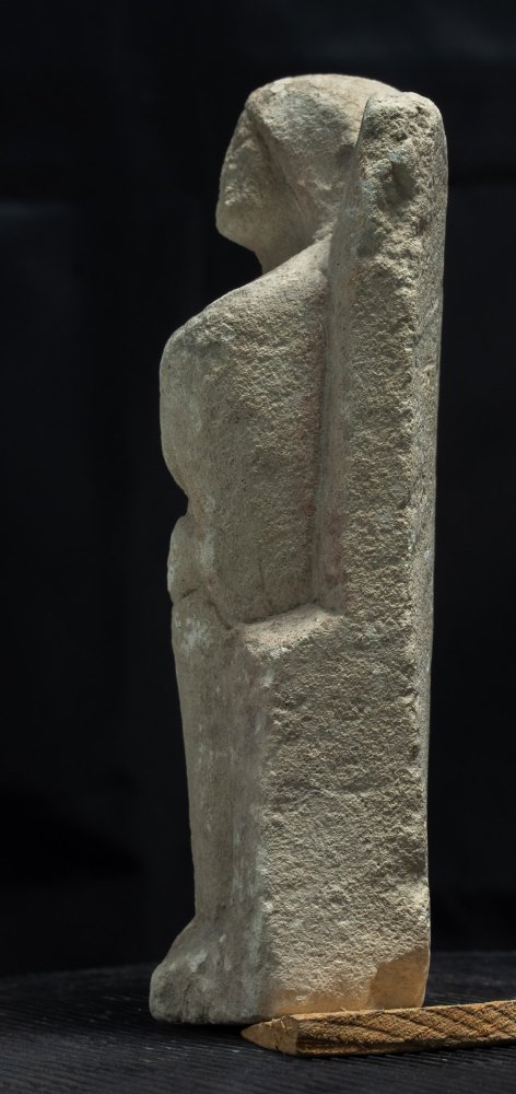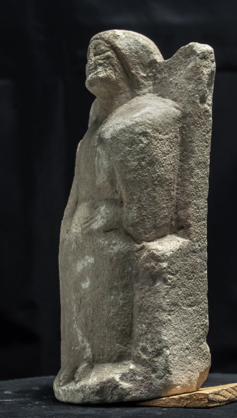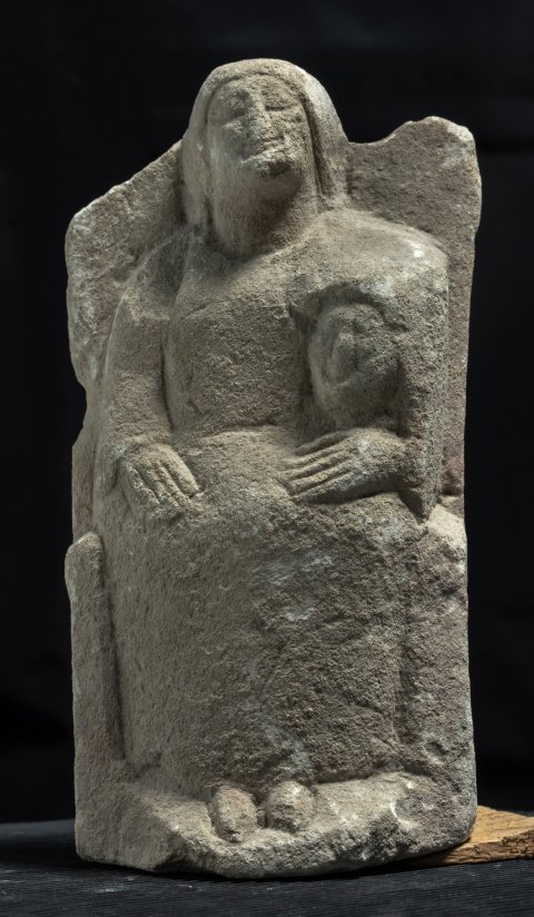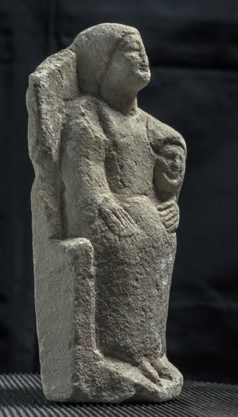 Mythische Figur: thronende Göttin (Kourotrophos), langes Ärmelgewand, auf den Knien Wickelkind.