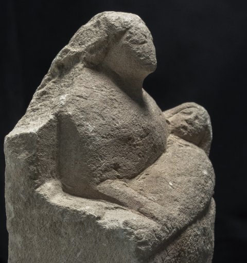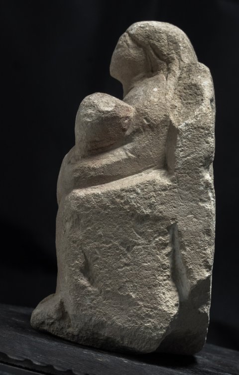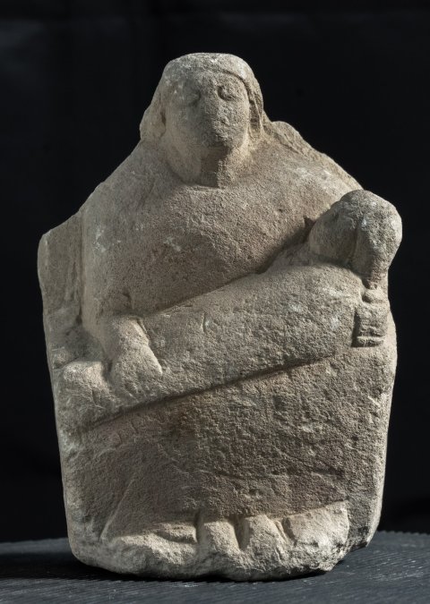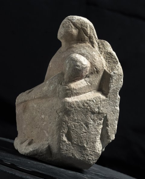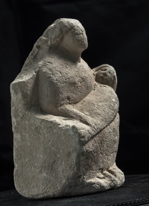 - Mythische Figur: thronende Göttin (Kourotrophos), langes Ärmelgewand, auf den Knien Wickelkind.