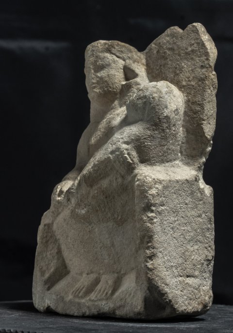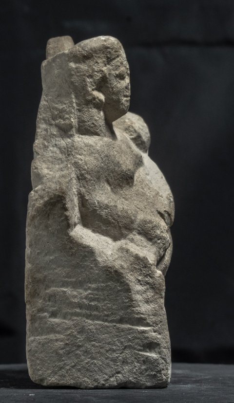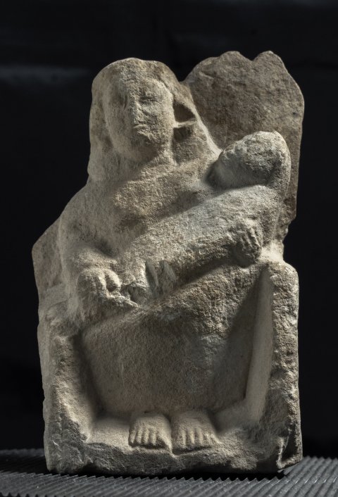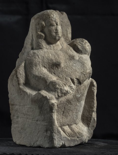 - Mythische Figur: thronende Göttin (Kourotrophos), langes Ärmelgewand, auf den Knien Wickelkind.