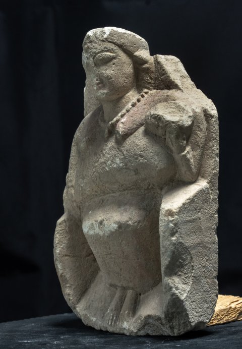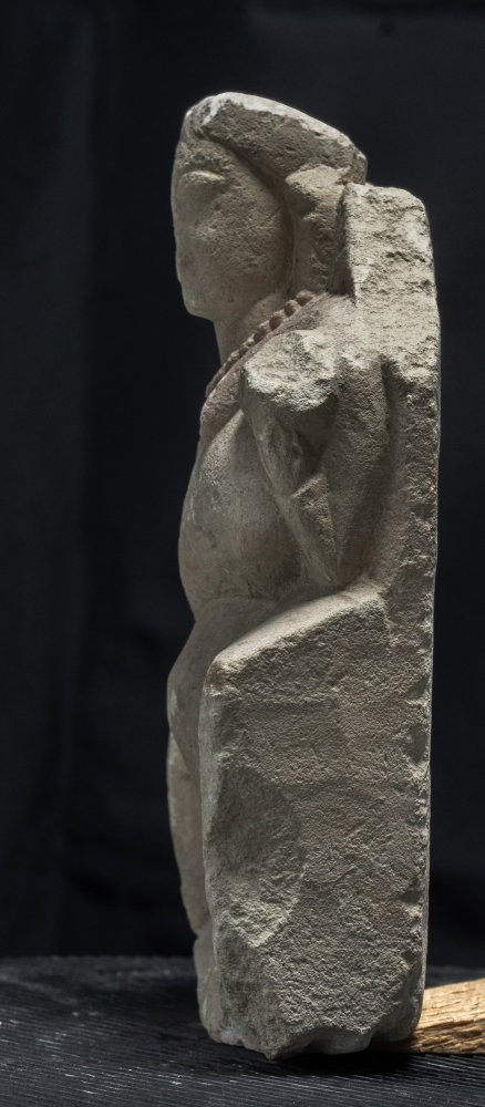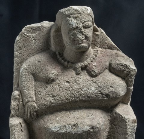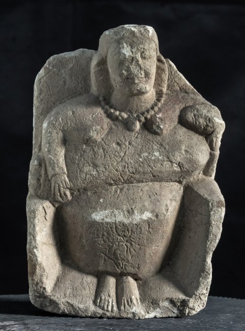- Mythische Figur: thronende Göttin (Kourotrophos), langes Ärmelgewand, Halskette mit Anhänger, auf den Knien Wickelkind.