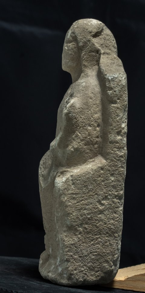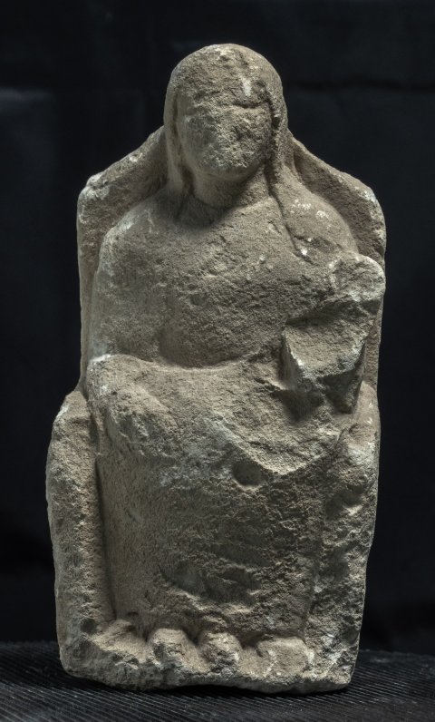 - Mythische Figur: thronende Göttin (Kourotrophos), langes Gewand, Schleier, auf den Knien Wickelkind.
