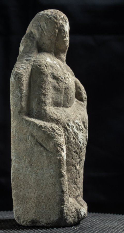 - Mythische Figur: thronende Göttin (Kourotrophos), langes Ärmelgewand, Schleier, auf den Knien Wickelkind.