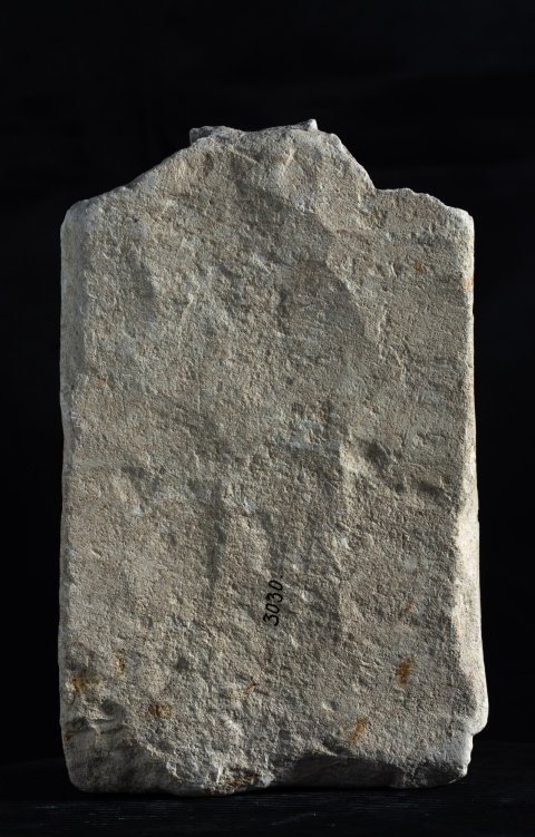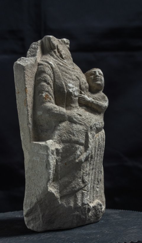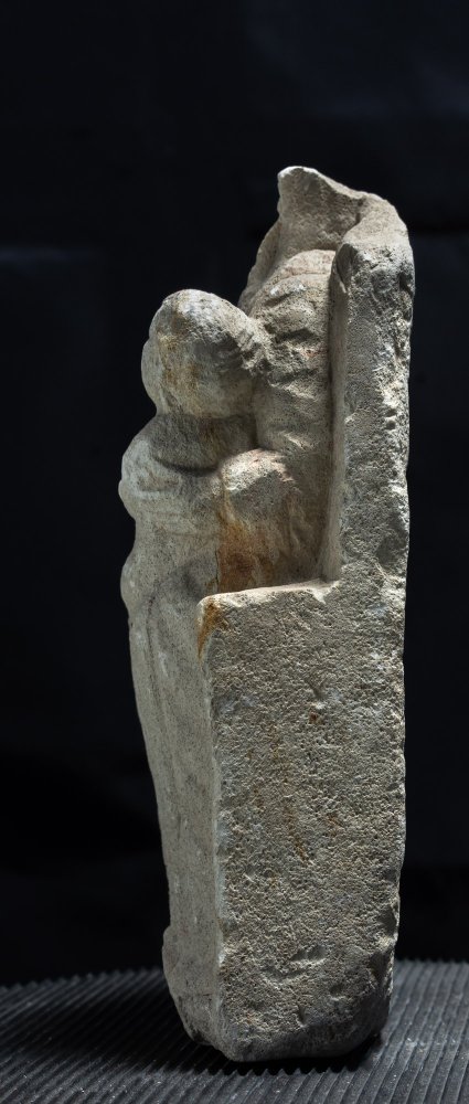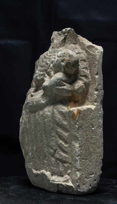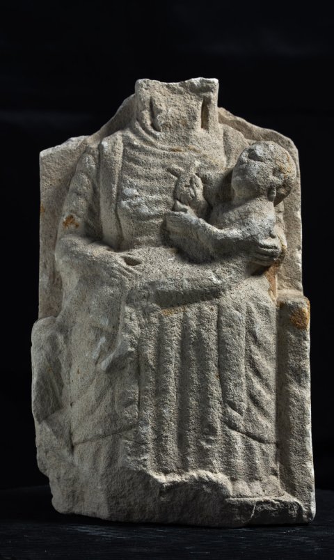 - Mythische Figur: thronende Göttin (Kourotrophos), langes Ärmelgewand, Mantel, Schleier, auf den Knien Kleinkind mit Band (?) in der rechten Hand.