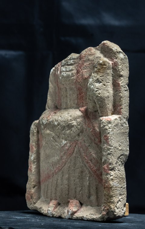 - Kopf abgebr., bestoßen, Reste roter Bemalung