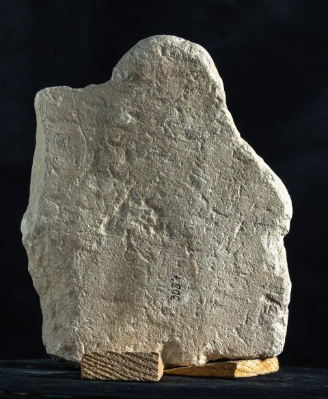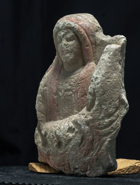 - bestoßen, untere Hälfte abgebr., Reste roter Bemalung