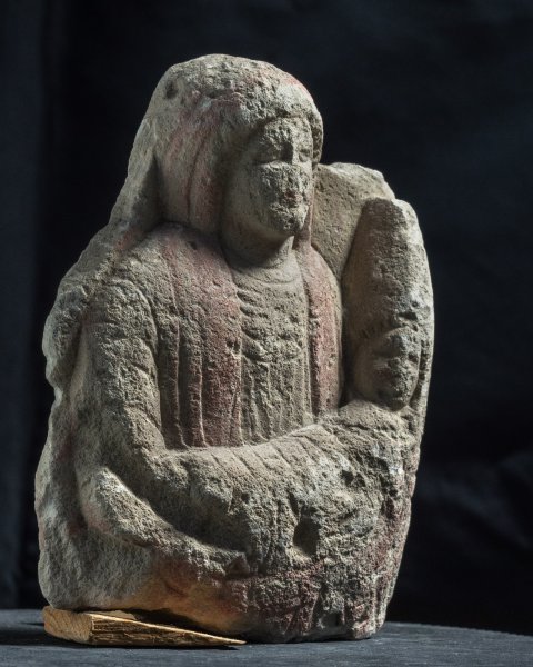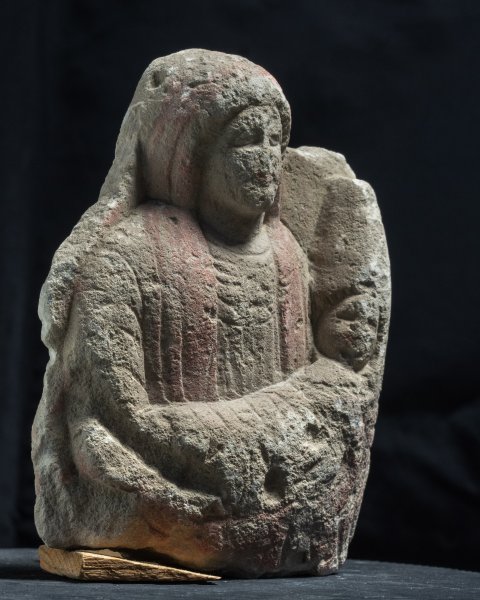 - Mythische Figur: thronende Göttin (Kourotrophos), langes Ärmelgewand, Schleier, auf den Knien Wickelkind.