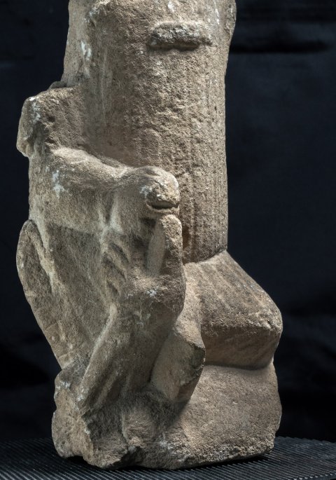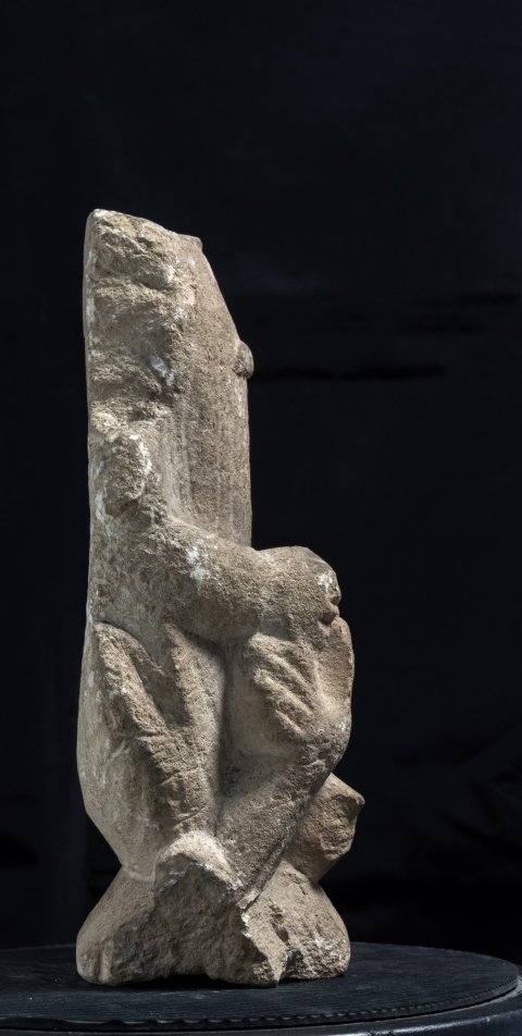 - Votivfigur. Auf dem Boden sitzender bekleideter Knabe, Genitalien entblößt, auf der Brust Bulla (Kapsel für Amulett).