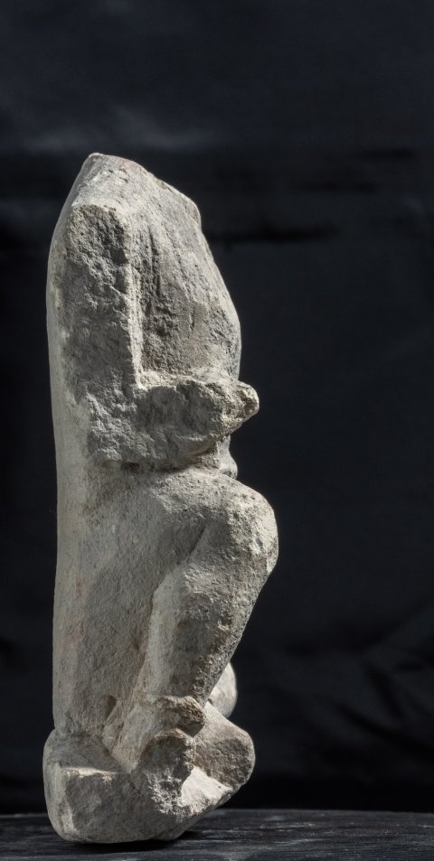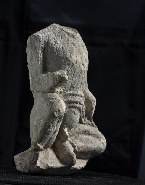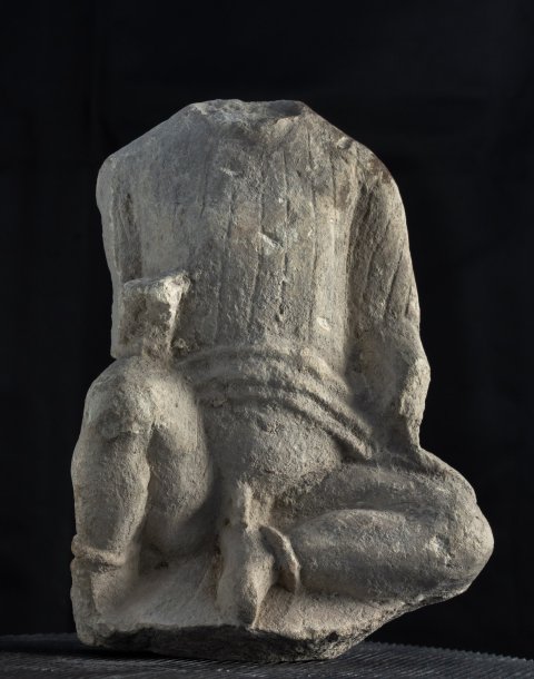 - Votivfigur. Auf dem Boden sitzender Knabe im Ärmelgewand, das über den Bauch hinaufgerafft ist, Reifen um die Fußgelenke.