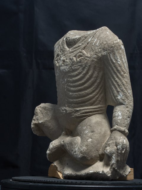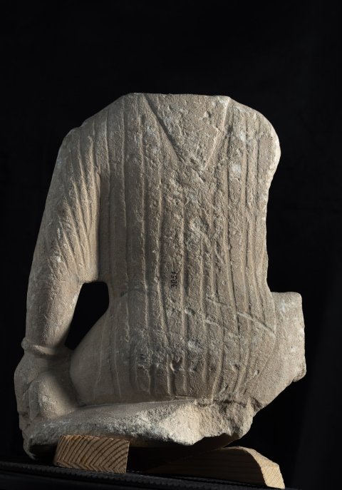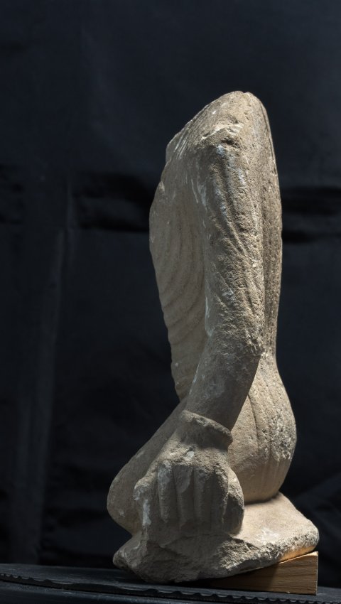 - Votivfigur. Auf dem Bogen sitzender Knabe im Ärmelgewand, Genitalien entblößt, Halsband mit Anhängern, Armreif, in der linken Hand Vogel (?).