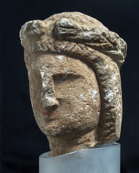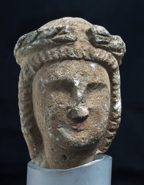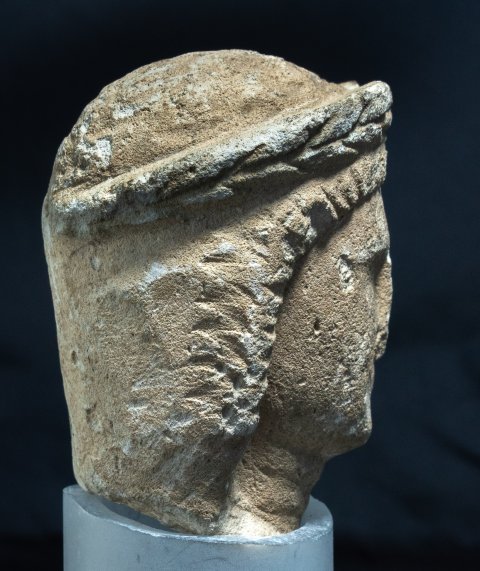 - Mythische Figur: Kopf des Apollo mit langem Haar und Lorbeerkranz.