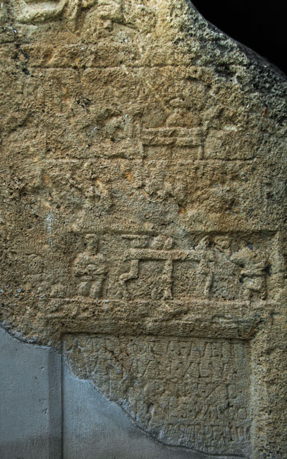 Darunter zwei Zwischenbilder. Im oberen Wagenszene (?), verschliffen, nur Pferd erkennbar. Im unteren Totenopfer: dreibeiniger Tisch, links Dienerin, rechts Diener. - Inschrift