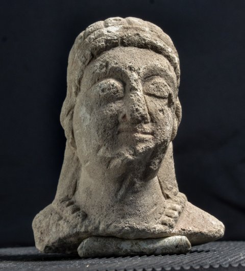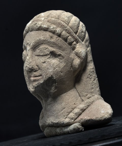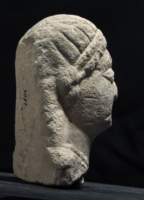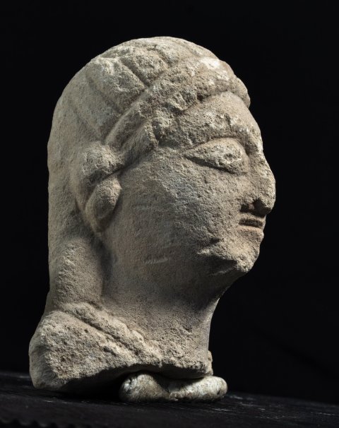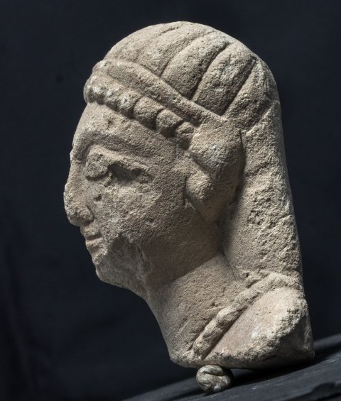 - Kopf einer Frau mit Binde im langen Haar und Halskette