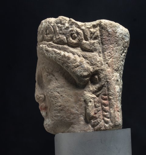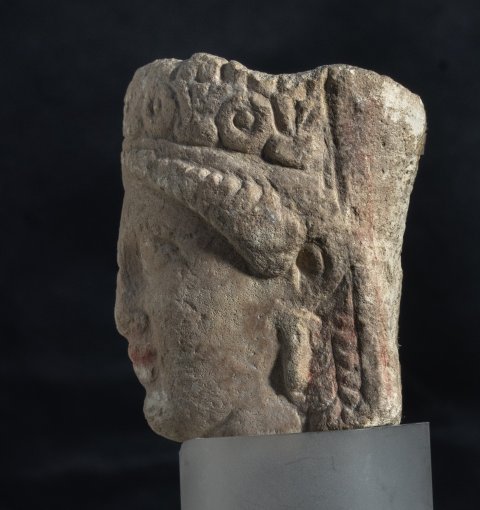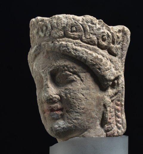 - Kopf einer Frau (Göttin) mit ornamentiertem Polos mit Schleier und Ohrschmuck
