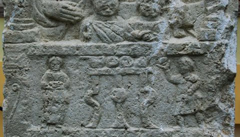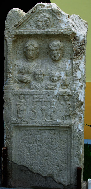 Im Hauptbild Familie : zwischen Säulen Brustbilder eines Ehepaares mit zwei Kindern. Links Frau: Frisur mit Mittelscheitel, Tunica, Mantel. Rechts Mann: bärtig, Locken, Sagum, Scheibenfibel, in der Linken Rolle (volumen). Vorn links Knabe (?), rechts Kind.