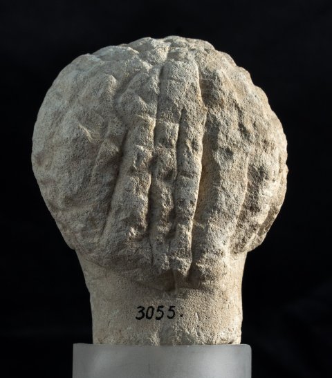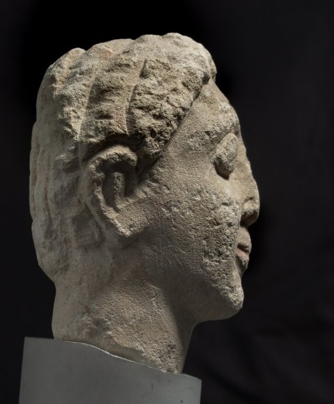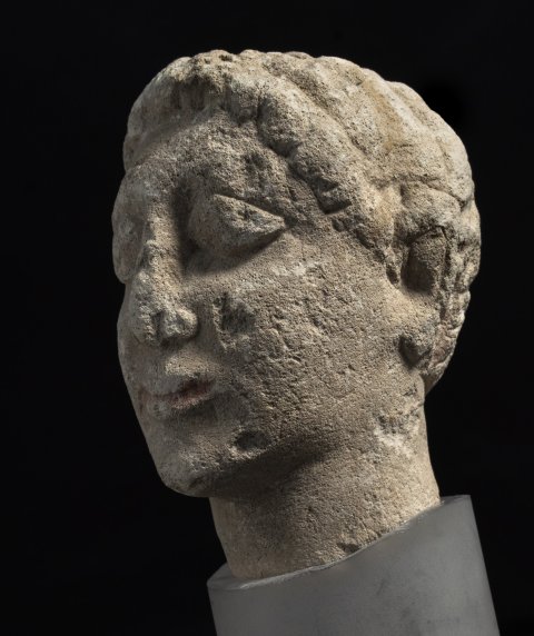 - bestoßen, Reste roter Bemalung, Bruch durch den Hals