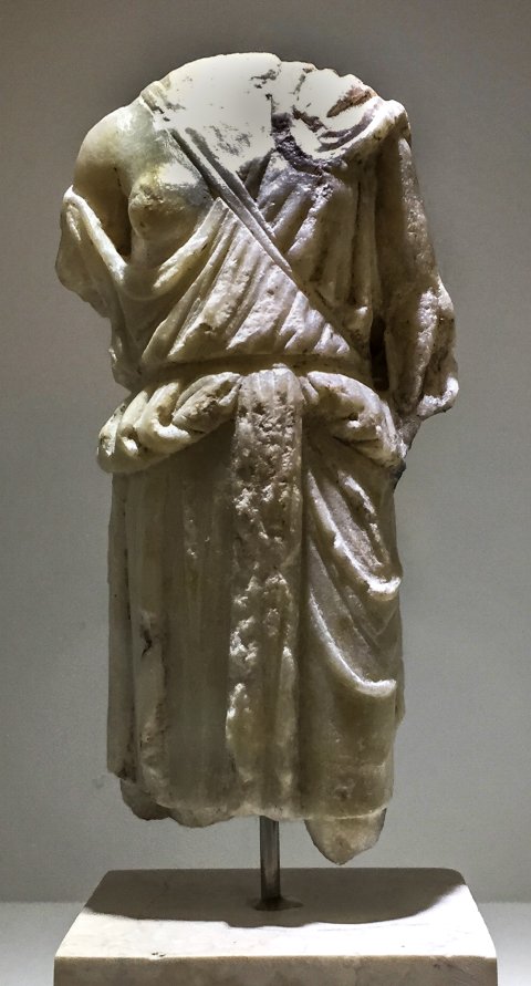 - Mythische Figur: stehende Diana in gegürtetem Chiton, rechte Brust entblößt, Köcherband über der Brust.
