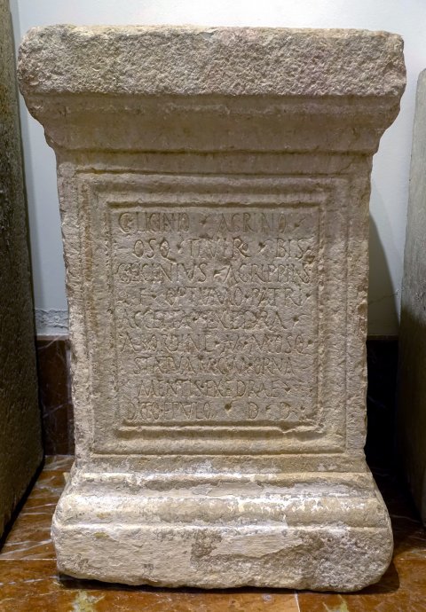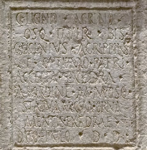 - G(aio) Licinio Agrino / Osq(uensi) IIviro bis / G(aius) Licinius Agrippinus / f(ilius) optumo(!) patri / accepta exedra / ab ordine m(unicipum) m(unicipii) Osq(uensis) / statuam cum orna/mentis exedrae / dato epulo d(edit) d(edicavit)