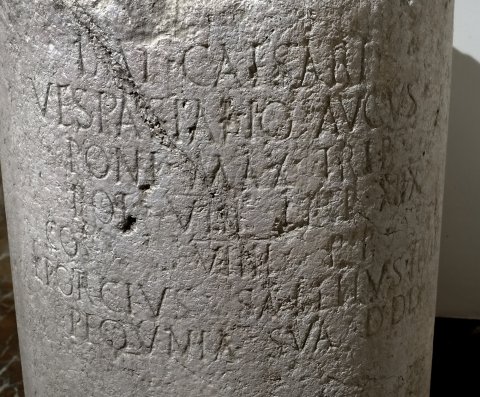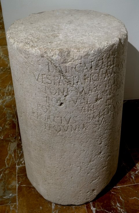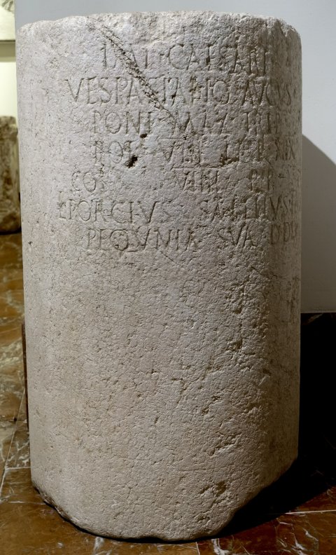 - Imp(eratori) Caesari / Vespasiano Augus(to) / pont(ifici) max(imo) trib(unicia) / pot(estate) VIII imp(eratori) XIIX / co(n)s(uli) VIII{I} p(atri) p(atriae) / L(ucius) Porcius Sabellus IIvir / pequnia sua d(ono) d(edit) d(edicavit)