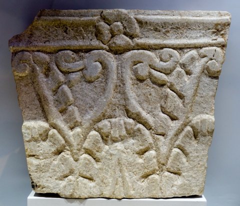 - Lisenenkapitelle mit Akanthusblättern und Volutenhaken, darüber Rahmenleiste mit Rosette
