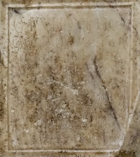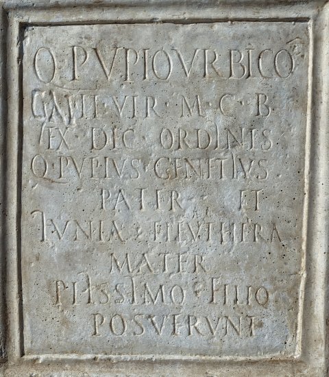 - Q(uinto) Pupio Urbico / Gal(eria) IIvir(o) m(unicipii) C(laudi) B(aelonensis) / ex dec(reto) ordinis / Q(uintus) Pupius Genetiv(u)s / pater et / Iunia Eleuthera / mater / piis(s)imo filio / posuerunt