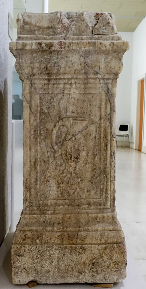 - Giebel mit Rosette zwischen geschnürten pulvini mit Rosetten. Auf den Nebenseiten Gefäße (rechts patera, darüber Tierkopf, links Kanne)